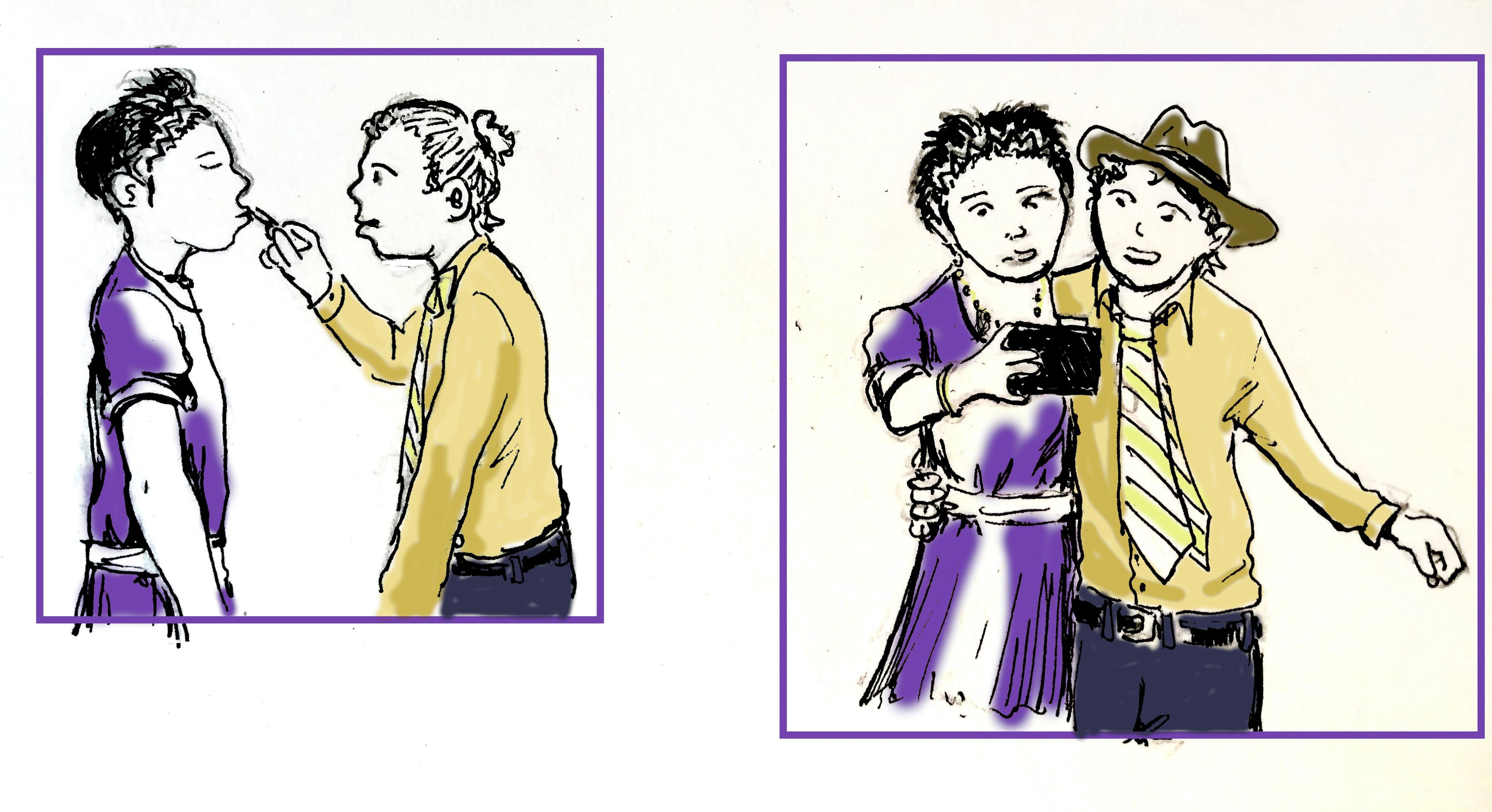 Kinktober day 2: Crossdressing. I get the sense that, even in a world teeming with toxic masculinity, Maurice wouldn’t be averse to playing at being a girl. Cathy would happily switch genders – she’s into performance arts, and she’s not very attached to her own identity. I wouldn’t say she’s nonbinary; more like… flexible. I thought it would be fun to emphasize the clothes here as they let their regular identities fade into the background.