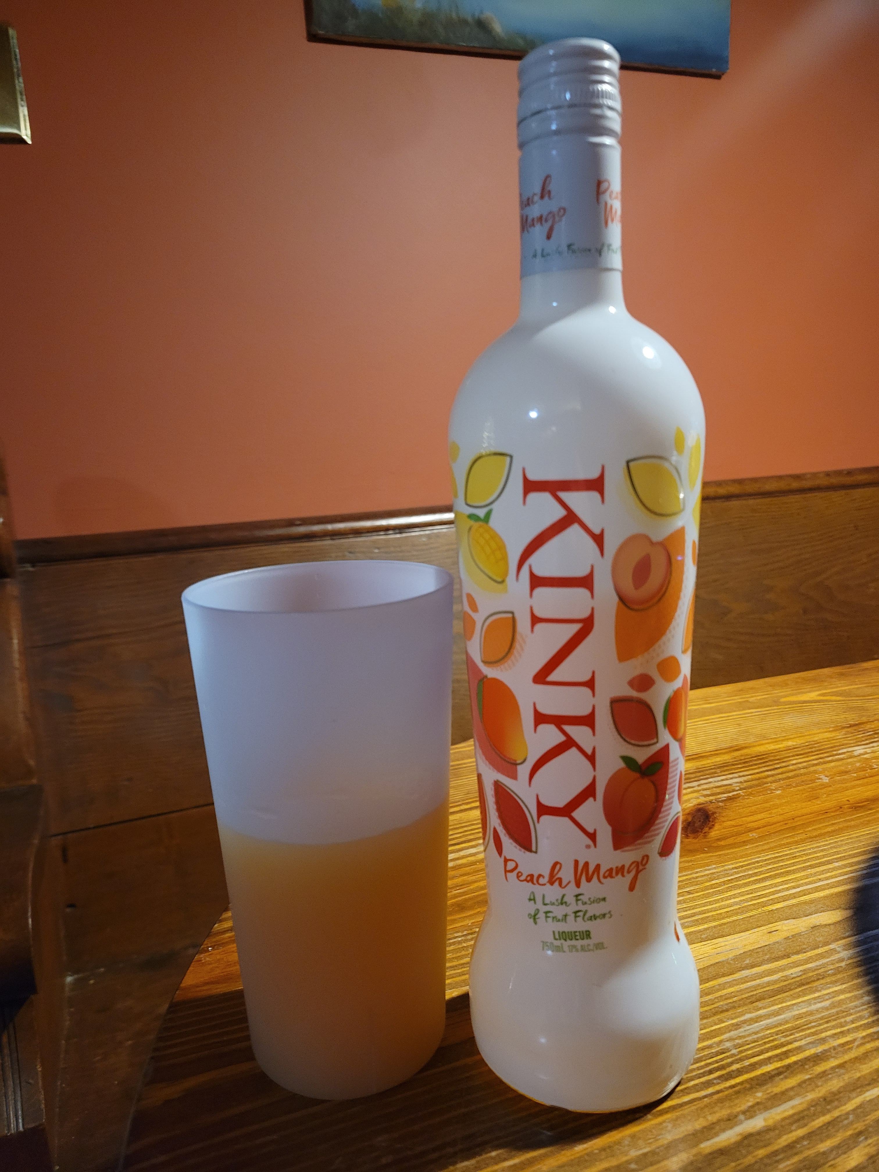 I mixed some cranberry, orange, and pineapple juices with this Kinky drink some friends got me. It was a delightful toast to a new month. And at least *something* in my life can be kinky this week. Due to a planned medical procedure, I’m not allowed to have penetration for five days. Day 2 done, but I suspect we’re going to find some other kinky things we can do without penetration soon. I’m dying here!